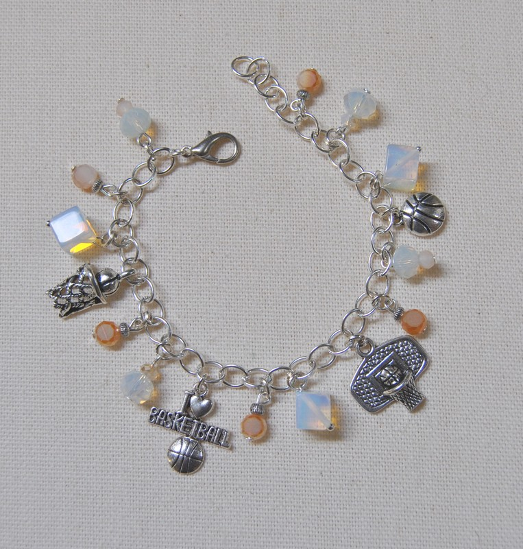 Bracelet thème BASKETBALL... Association de perles en cristal et de perles en pierre naturelle (pierre de lune)