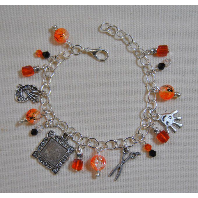 Bracelet à thème LOISIRS CREATIFS : peinture, encadrement, ciseaux à papier et travail manuel... Association de perles en verre artisanal, en verre craquelé et perles en cristal.